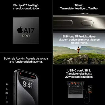 Descubre la máxima innovación con el iPhone 15 Pro Max 1TB en Titanio Natural, un smartphone diseñado para ofrecer rendimiento profesional, resistencia y elegancia incomparable. Su estructura de titanio de grado aeroespacial, el poderoso chip A17 Pro y la tecnología eSIM lo convierten en un dispositivo preparado para el futuro.